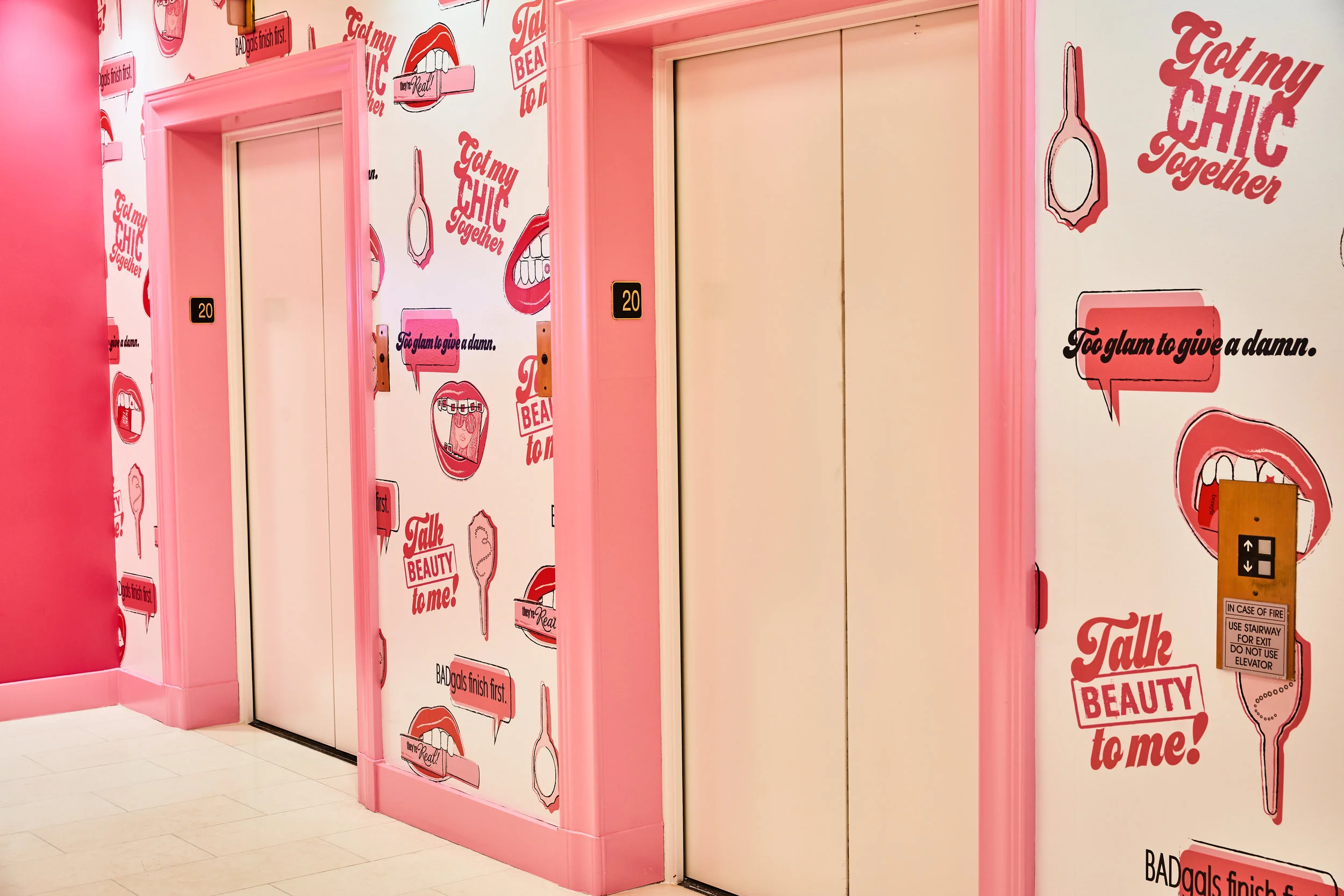 Going for a chic and pink theme, Coloredge produced and installed the wrapping around the elevators, the vibrant and reflective reception desk and the custom graphic gold lettering on the decorative stack of books that helped to communicate the brand’s manifesto.